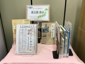 この度、頂いた資料一式を学校図書館に寄贈し、期間限定ですが図書館に「長久保赤水コーナー」を設けております。