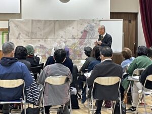 講座資料として、「赤水図」原寸大レプリカや拡大図を持参しました。更に、長久保赤水顕彰会発行の各種書籍等を提供。「長久保赤水」が製作した「赤水図」が、現代の日本地図により近く、精度が高い地図であることを、ぜひ多くの方々に目にしていただけるよう願っています。